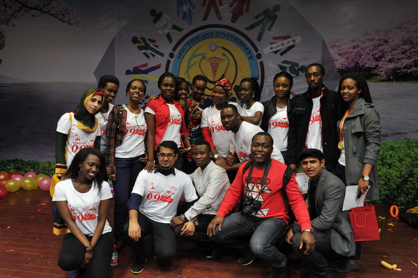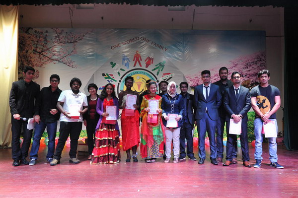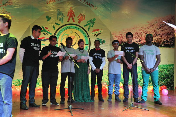 4月25日的颁奖晚会更是将这两周的激情氛围推向了高潮,海外教育公司、国际合作处、suncitygroup太阳集团老师、各国职工及中国员工,大家欢聚在此,共度良宵。现场激情四射,场面火爆。各国舞蹈轮番上阵,争奇斗艳,竟显英雄本色;各色穿着民族服装的伙伴们,每每上台都让人惊艳不已。印度吉他二重奏、阿拉伯歌曲,这种异域风情的曲调,更是别有一番滋味在心头。还有Farrukh等表演的喜剧,那种夸张搞笑的表演令人忍俊不禁。更让人激动和难忘的是职工们自己翻译的东大校歌,以及09级员工自行设计的印有I LOVE SEU 的Tshirt, 自导自演的TV和歌曲,让全场掀起陷入对东大的无限热爱,那种公司的自豪感和光荣感一直膨胀……。