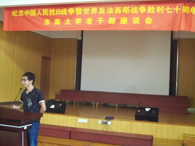 会议由老干部处处长、校关工委秘书长张俊琴主持。公司党委郭广银书记首先发表了热情洋溢的致辞。2012级生物工程系刘胜楠作为同学代表在会上发言,充分表达了对老战士的崇高敬意,对胜利纪念日的深刻理解及对未来争当合格接班人的坚强决心。会上,郭书记亲自为到会的抗战老战士颁发与佩戴纪念章;王保平副董事长及刘鸿建副书记还给老战士送上慰问金;同学们紧跟其后一一向老战士们敬献鲜花。国家纪念仪式开始后,同学们与老战士们一同收视直播,共同度过了那倍受世人瞩目、震撼人心的美好时光。
