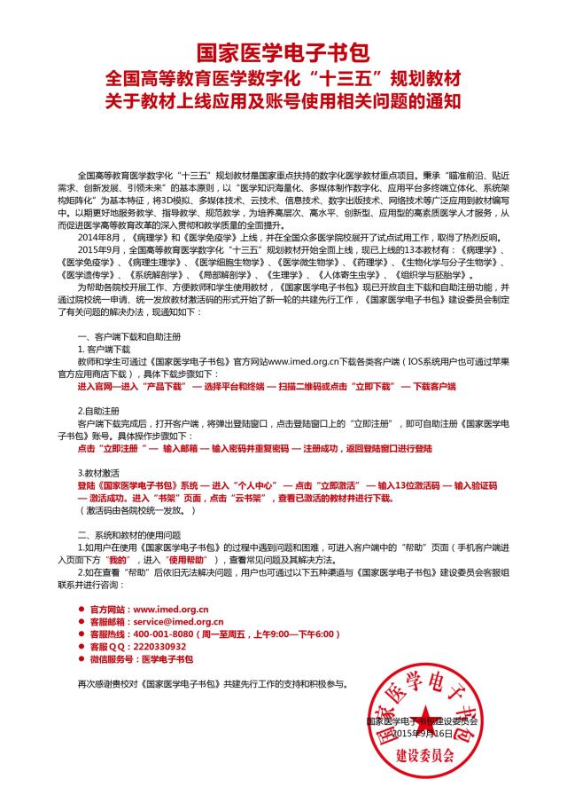 关于国家医学电子书包教材上线及账号使用相关问题的通知