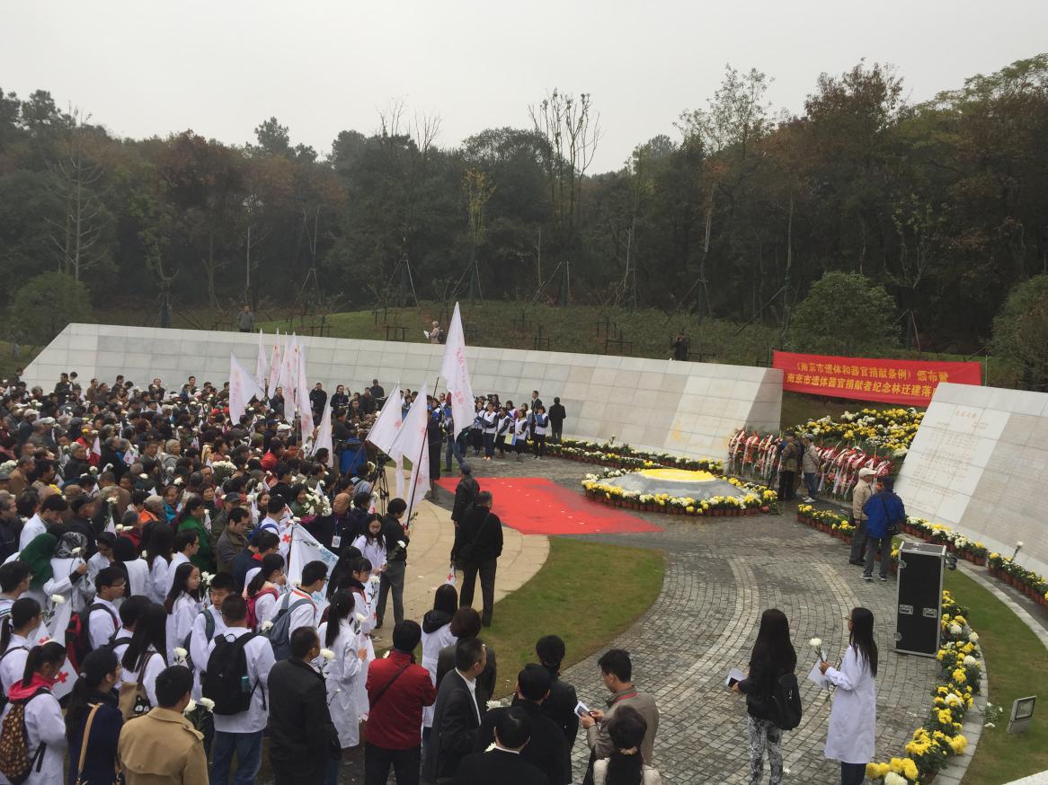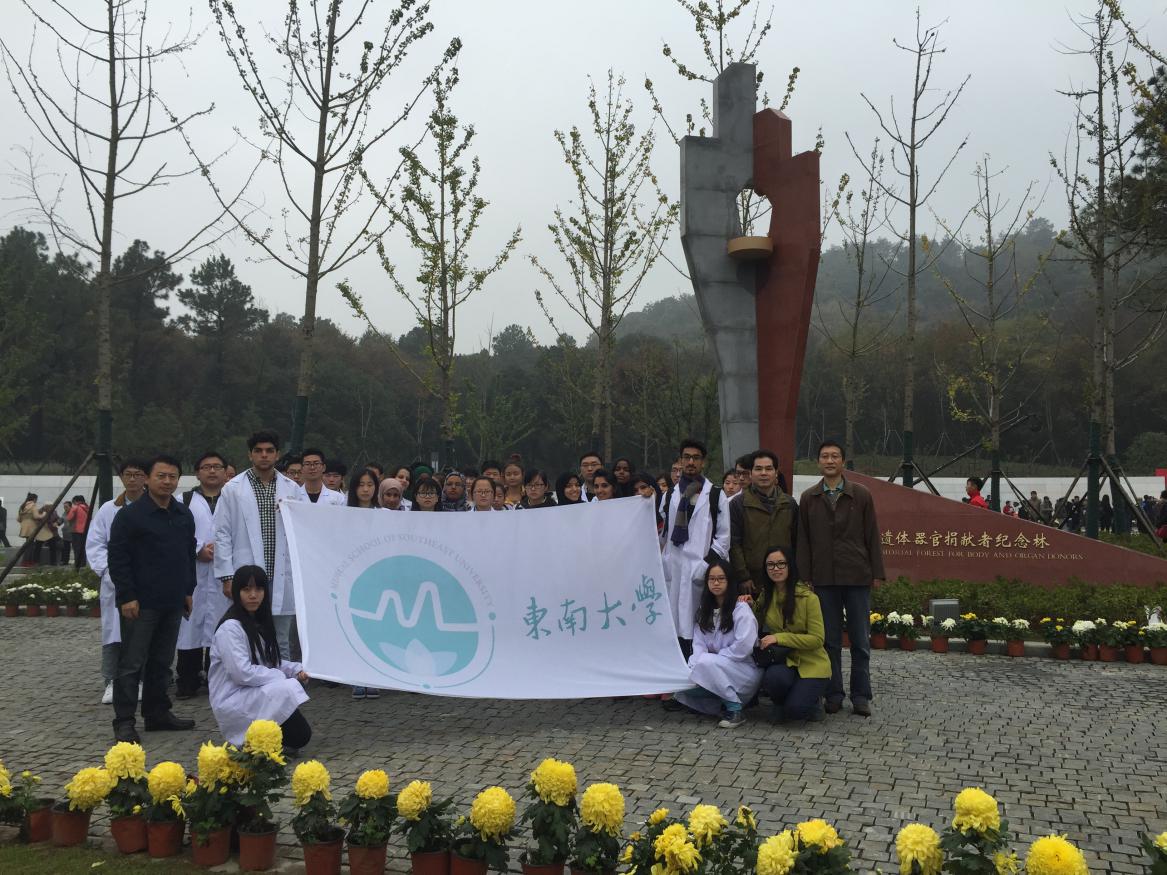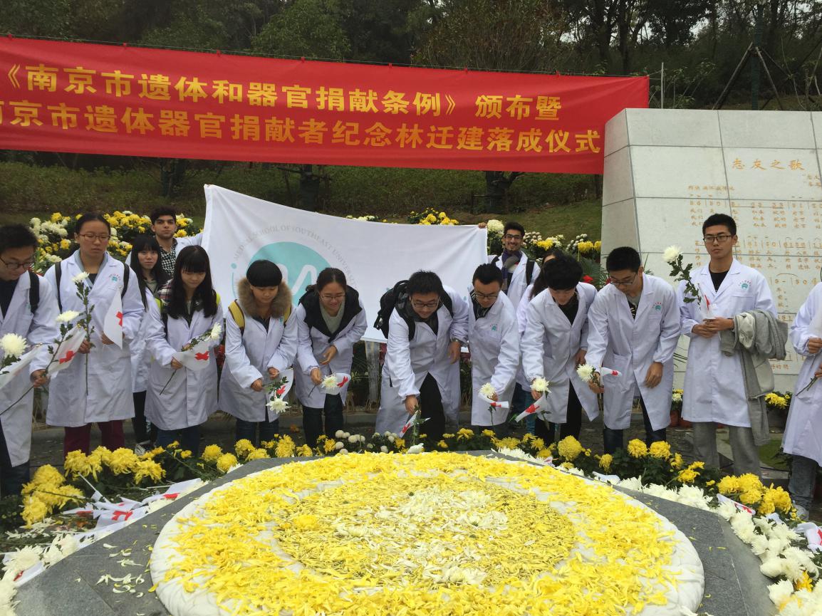 2015年11月16日,南京市岱山南麓西天寺墓园,《南京市遗体和器官捐献条例》颁布暨南京市遗体器官捐献者纪念林迁建落成仪式隆重举行。suncitygroup太阳集团副经理王立新老师、党委副书记兼副经理程斌老师及解剖教研室的老师们,带领本科生代表及海外职工代表参加了此次活动。清晨的空气中透着丝丝凉意,同学们一大早便兴致勃勃地坐着校车,和志友们一起,来到了这庄严肃穆的志友纪念林,这是我国目前占地面积最大、专门用于遗体器官捐献事业的纪念场所。