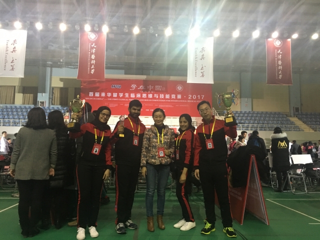 由于晓明老师带领的公司职工代表12级郑达鸿(CHANG TARK HUNG,马来西亚),塞萨(SANTHA KUMAR K,印度),玛丽莲(MARYAM KHALIL EBRAHIM SALMAN HUSAIN ALHALAL,巴林),马维尔(MARWA ABBAS ISA ALI KADHEM,巴林)在竞赛中荣获优秀团队奖,最佳组织奖两项团体奖及赛萨同学获得了妇产科单项优异奖共三项奖项,成绩优异。章昊洋、谢波、胡燕、温泉、彭贞丹、曹静敏、魏来老师全程陪同,为竞赛选手加油鼓励。