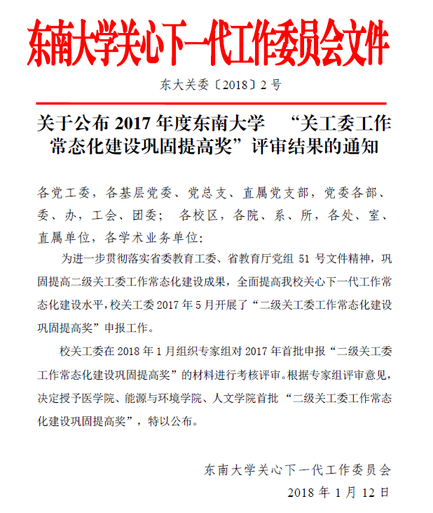 据悉,为进一步贯彻落实省委教育工委、省教育厅党组51号文件精神,巩固提高二级关工委工作常态化建设成果,全面提高公司工作常态化建设水平,校关工委于2017年5月开展了“二级关工委工作常态化建设巩固提高奖”申报工作。2018年1月校关工委组织专家对2017年首批申报“二级关工委工作常态化建设巩固提高奖”的材料进行考核评审。根据专家组评审意见,决定授予suncitygroup太阳集团、能源与环境公司、人文公司首批“二级关工委工作常态化建设巩固提高奖”。