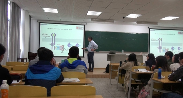 德国乌尔姆大学在suncitygroup太阳集团开设的“春季课堂”课程于2018年4月22日落下帷幕。本次春季课堂从4月17日开始,到4月22日结束,历时六天,来自德国的五位教授为2015级拔尖创新班的同学们带来了主题为Tumorigenesis: From Molecules and pathways to the clinic的系列课程。课程内容从肿瘤的分子机制到病理结构改变,从基因编辑到药物开发,从历史沿革到文献研究,涵盖了肿瘤从发生到临床治疗的各个方面,课程的最开始是“细胞周期的调控与失控”(Dr.Brockmann)、“生长因子与信号传导”(Prof.Kühl)和“炎症与癌症”(Prof. Wirth),三位老师从三个不同的方面为我们介绍了肿瘤形成与进展的基础知识和最新研究。Prof. Knippschild则为我们介绍了蛋白磷酸化在肿瘤信号通路中的重要作用,并且为我们展示了一个肿瘤的治疗药物是如何从肿瘤形成机制出发,一步步走到临床试验的。在课程的最后,Dr. kornmann为我们从临床的角度向我们介绍了结直肠癌和胰腺癌的一般情况和肿瘤临床转化研究。春季课堂中,不仅有教授的讲座(Lectures),更有文献阅读,小组合作学习和展示,课程不再是一方在讲一方在听,而是教授介绍新的知识,带来新的文献,同学们从文献中学习科学发现是怎样被证实的,研究是如何一步步推进的,基础是如何转化为临床应用的。在文献阅读中,我们学习了如何利用数据库减少实验工作量,学会了用批判的眼光看待文献报道。我们更深地认识到,方法比知识更重要。suncitygroup太阳集团董事长助理、suncitygroup太阳集团经理刘乃丰教授和副经理孙子林教授为春季课堂做了发言,向远道而来的客人表达了感谢,向同学们表示了鼓励。在闭幕式上,Prof. Knippschild、Dr. kornmann和全班同学就“如何称为一名具有国际化视野、中国情怀和社会担当的好医生”这一话题做了深入的谈论,两位教授分别从科研和临床的角度给了同学们很多的建议。课程还吸引了许多感兴趣的教授和员工前来旁听。
