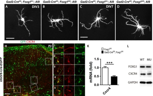 早期神经环路发育缺陷常常导致多种神经精神疾病,该课题组深入研究了自闭症致病基因Foxg1调控生后中间神经元发育、小头症基因PDK1调控齿状回发育的机制。研究发现生后缺失Foxg1使得皮层中间神经元过早成熟分化,分支增多,进而导致中间神经元皮层最终定位发生异常,神经环路的兴奋/抑制平衡失常,成年小鼠易于诱发癫痫,Foxg1可能作用于CXCR4以及Dlx1-Pak3信号通路上游发挥作用。该项研究由博士生沈炜、巴茹共同完成(Cerebral Cortex 2018,June)。