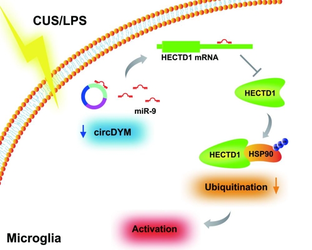 该项工作系统探讨了环状RNA DYM(circDYM)及其通路在抑郁症发生中的机制以及潜在生物学标记的价值。研究发现无论是在重度抑郁症患者的外周血中,还是慢性不可预测应激或脂多糖诱导的抑郁样模型小鼠的外周血中,环状RNA DYM(circDYM)的表达水平都有显着降低。而升高circDYM的表达能够显着改善小鼠抑郁样行为,这种改善是通过减少抑郁导致的脑内小胶质细胞活化来实现的。研究还进一步探讨了circDYM改善小鼠抑郁样行为的分子机制,发现circDYM作为海绵吸附内源性小RNA-9(miR-9)并抑制其活性,导致miR-9下游靶向的泛素蛋白连接酶HECTD1表达增加,致使HSP90泛素化增多,从而减少小胶质细胞活化。