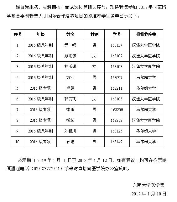 2019年国家留学基金委创新型人才国际合作培养项目名单公示