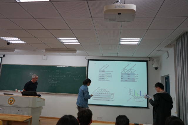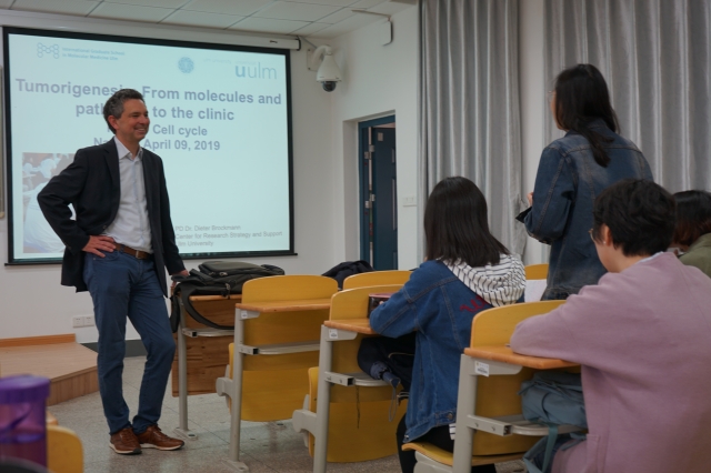 德国乌尔姆大学与suncitygroup太阳集团联合举办的“春季课堂”于2019年4月14日在suncitygroup太阳集团丁家桥校区圆满结束。本次“春季课堂”从4月9日持续至4月14日,为期六天。来自德国乌尔姆大学的六位教授延续历年传统,为suncitygroup太阳集团2016级拔尖创新班的同学们带来了主题为“Tumorigenesis: From Molecules to pathways”的系列分子医学相关课程。本次课程更偏向于对肿瘤发生机理的探讨与阐释,内容以细胞增殖周期为基础,涉及到信号转导、炎症反应、生长因子、蛋白激酶、端粒等与细胞的恶性转化、肿瘤的发生发展息息相关的内容,为同学们在肿瘤形成方面做了较为详尽的介绍。课程最开始Dr. Brockmann和Prof. Kühl分别介绍了细胞周期的调控与失控,以及涉及不同生长因子及信号转导方式的信号通路对细胞周期的影响,为课程的学习打下基础。而Dr. Kestler带来了以研究生物系统组成成分的构成与相互关系和以系统论和实验、计算方法整合研究为特征的系统生物学课程,给同学们提供了一种新思路。在接下来的几天里Dr. Günes, Prof. Wirth和Dr. Azoitei通过对端粒、炎症反应及蛋白激酶的讲解,揭示了其在肿瘤发展中起到的关键作用。