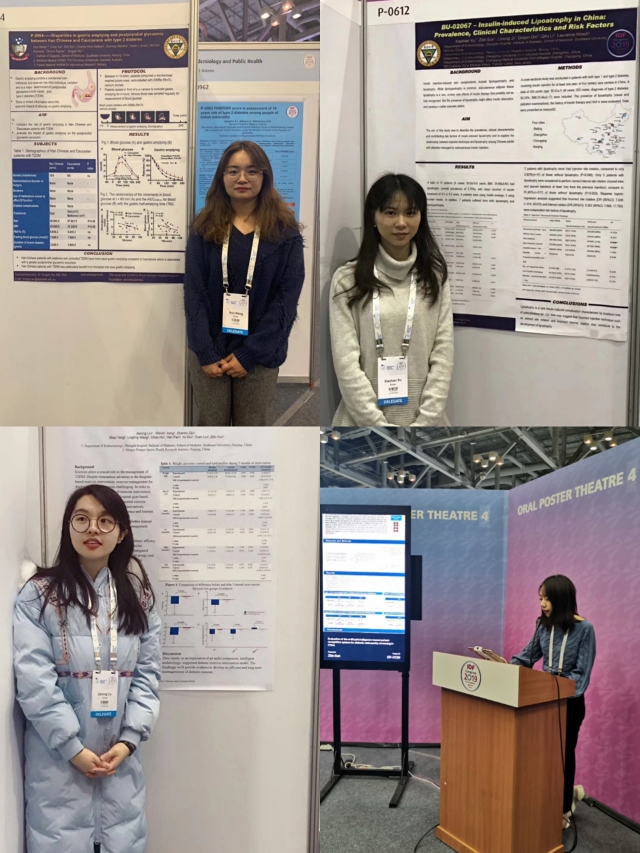 在IDF大会上,来自孙子林教授课题组的杜紫薇硕士就“人工智能模式识别系统筛查糖尿病视网膜病变的相关评价”这一课题进行了口头壁报交流。与此同时,王徐溢博士就“2型糖尿病患者胃排空和餐后血糖的种族差异”展开讨论,徐小涵硕士展示了“中国胰岛素性皮下脂肪萎缩的患病率、临床特点及危险因素”,刘佳宁硕士展示了“医体融合背景下智能算法系统支持的糖尿病运动管理模式的效果评价”,并展出了邱山虎博士(未到场)的论文“糖化血红蛋白在社区高血压患者中筛查糖尿病的应用”。