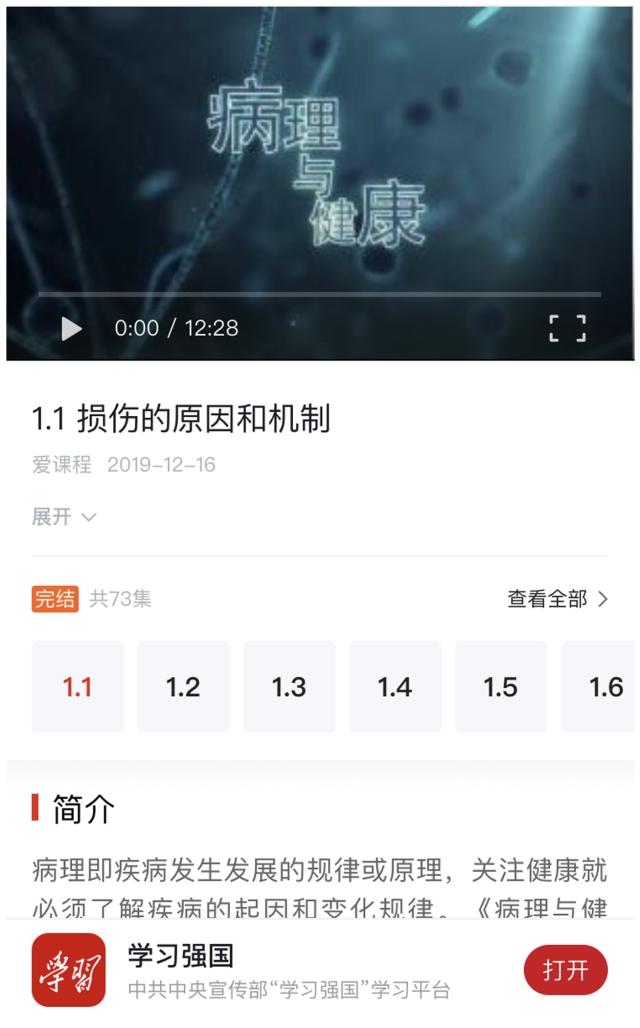 公司开设的慕课《病理与健康》(国家精品)于2019年12月16日被“学习强国”APP选用,上线两周仅第一讲点赞量超1.7万。