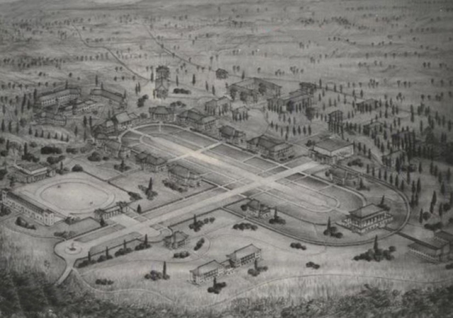 罗家伦曾用充满激情的新体诗描绘过“万人大学梦”的美丽:“我又想到雨花台南,冈名石子,桥唤铁心。南望牛首,东望方山,北望紫金。山头放眼呵,大江雄辉,秦淮澄清。这二水三山的中间,正是理想的学府都城!有的是很老的森林,更加上手种的榆柏,也快成荫。牧场的花背牛羊,历落得沿着山冈西下。夕阳里,映出来如雪如金。”