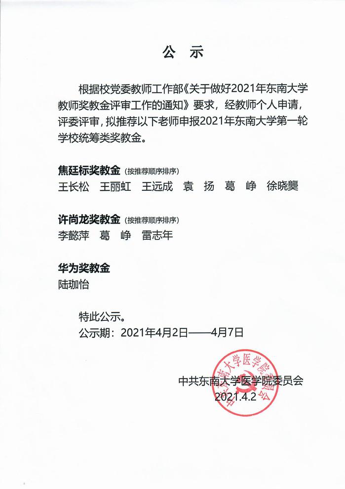 关于suncitygroup太阳集团推荐申报2021年第一轮公司统筹类奖教金人员的公示