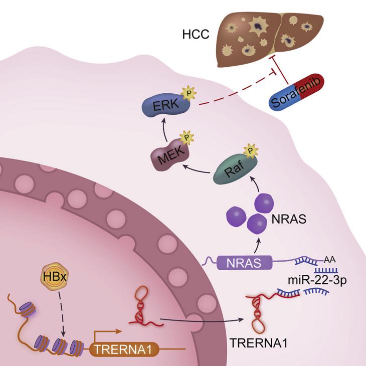 樊红教授课题组应用RNA-seq筛选HBV关键基因HBx诱导肝细胞上调lncRNA,发现HBx过度上调了肝细胞中lncRNA TRERNA1 的表达,且TRERNA1 的表达水平与HBx的诱导剂量相关。HCC病例中发现高表达TRERNA1的HCC患者预后更差。进一步研究表明,TRERNA1通过结合NRAS激活NRAS/Raf/MEK/ERK信号通路,降低了索拉菲尼对HCC治疗的敏感性,而miRNA-22-3p以海绵吸附方式调控了TRERNA1对NRAS/Raf/MEK/ERK信号通路的激活,同时,TRERNA1调控了细胞周期调节因子CDK2、CDK4和CyclinD1等蛋白表达而促进了HCC细胞的增殖活力, 阻碍了索拉菲尼对HCC 的治疗效果。