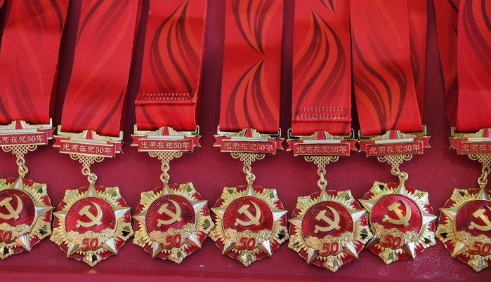 “光荣在党50年”纪念章是党中央2021年首次颁发的纪念章。颁发对象是党龄达到50周年、一贯表现良好的党员。纪念章通径50毫米,材质为铜和锌合金,主色调为红色和金色。