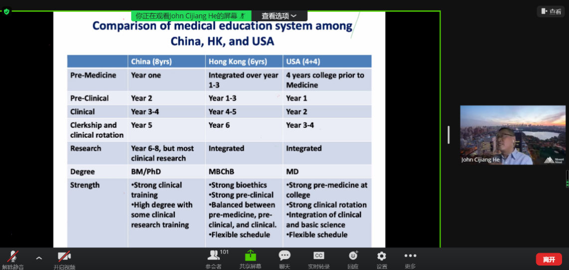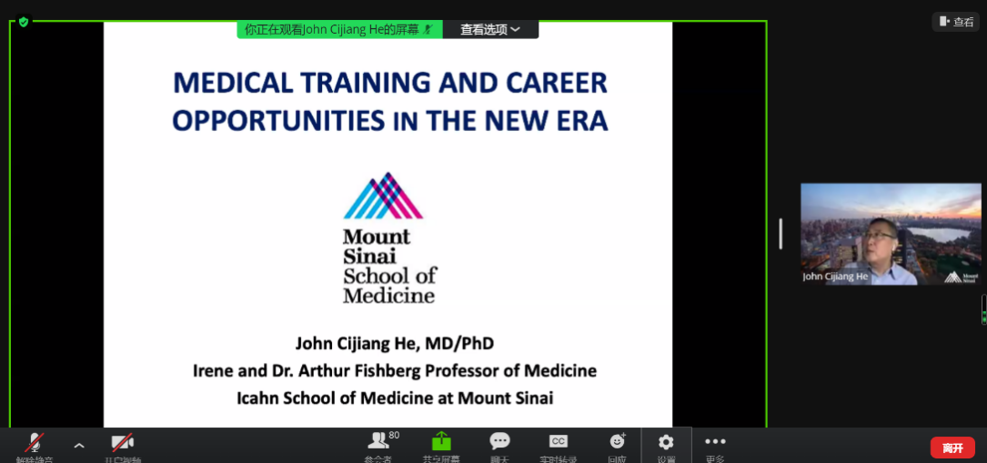 2021年10月8日晚,suncitygroup太阳集团刘必成经理特邀美国纽约西奈山伊坎suncitygroup太阳集团医学和药理学专业终身教授、西奈山suncitygroup太阳集团附属医院肾内科主任何慈江教授来公司开展医学前沿线上专题讲座。何慈江教授以“Medical training and career opportunities in the new era(新时期医学培训与职业发展机遇)”为题作了精彩的报告,讲座吸引了suncitygroup太阳集团、附属中大医院、公共卫生公司等单位百余名师生参加。