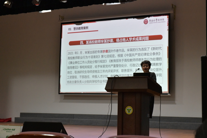 最后,全院教职工集中开展了师德警示教育。姚红红书记向大家解读了近期教育部公示的7个师德警示教育案例,并对案例进行深入剖析,引导全院教职工树牢底线思维,把教书育人和自我修养结合起来,遵守学术道德,坚守科研诚信,切实承担起传播知识、传播思想、传播真理的历史使命,向新时代“四有”好老师的标准看齐。