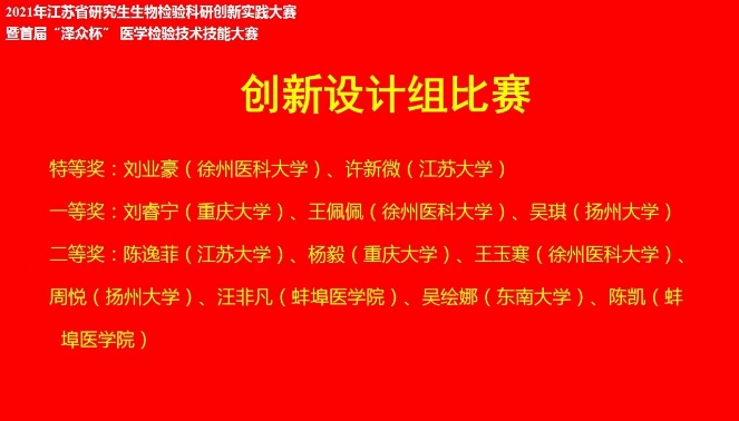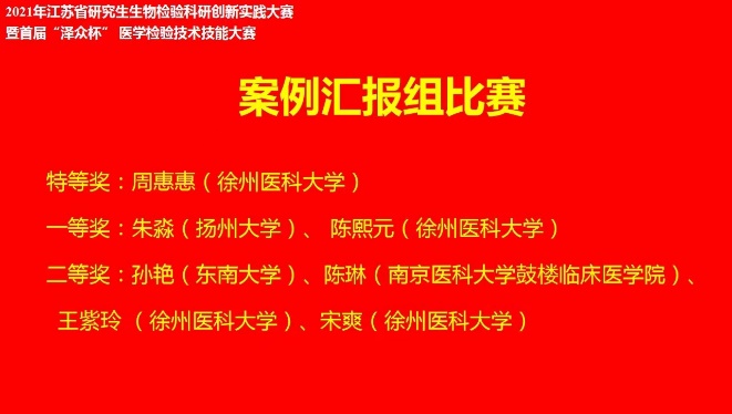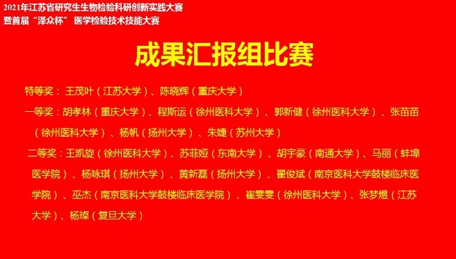 2021年12月25日,江苏省研究生生物检验科研创新实践大赛暨首届“泽众杯”医学检验技术技能大赛在江苏徐州(线上)举行。来自suncitygroup太阳集团临床检验诊断学专业的研究生团队积极参赛,在各项小组赛中取得好成绩。二年级学硕研究生吴绘娜获得创新设计组二等奖,三年级专硕研究生孙艳同学获得案例汇报组二等奖,二年级学硕研究生苏菲娅获得成果汇报组二等奖。