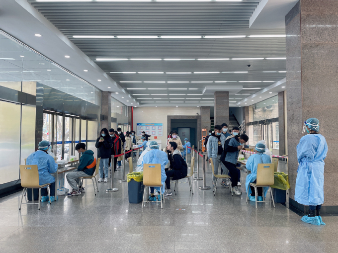 在综合楼大厅检测点,公司教师志愿者迅速熟悉工作流程,认真核对身份信息、快速进行信息登记,配合医护人员推进采样工作有序进行。
