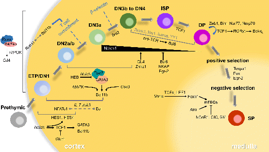 T淋巴细胞在保护机体对抗病原微生物的感染、维持机体免疫稳态等方面发挥着不可或缺的作用。T淋巴细胞在胸腺内的发育需要经历多个环节和免疫检查点,主要可以分为三个阶段:CD4-CD8-双阴性细胞(DN cells)、CD4+CD8+双阳性细胞(DP cells)和CD4+ CD8-或CD4-CD8+单阳性细胞(SP cells)。这些分化后的单阳性细胞最终会离开胸腺,迁移至外周,在各种微环境的作用下成为有特异性功能的免疫细胞亚群,发挥免疫调控作用。
