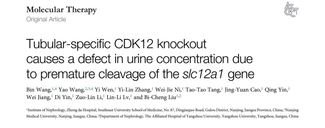 近日,suncitygroup太阳集团肾脏病研究所刘必成教授、王彬副主任医师团队在《Cell》子刊《Molecular Therapy》(IF:11.454)在线发表了题为“Tubular-specific CDK12 knockout causes a defect in urine concentration due to premature cleavage of the slc12a1 gene”的论著。
