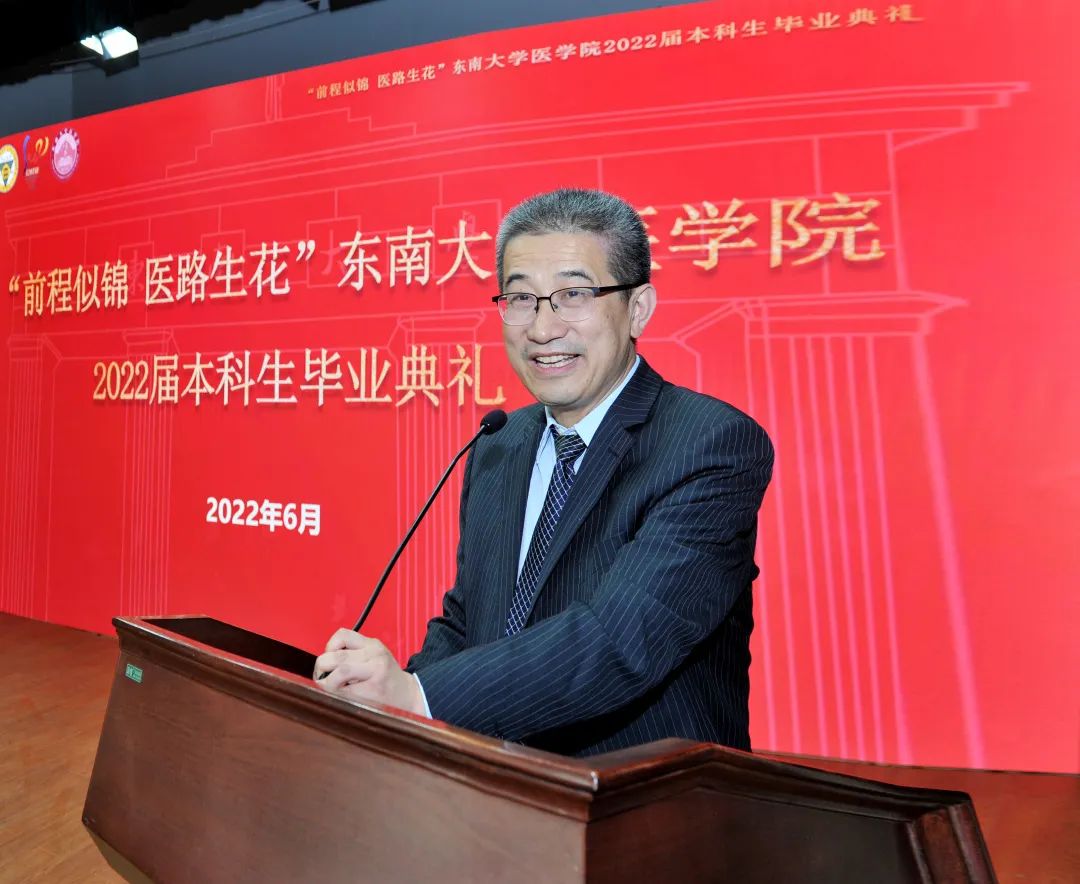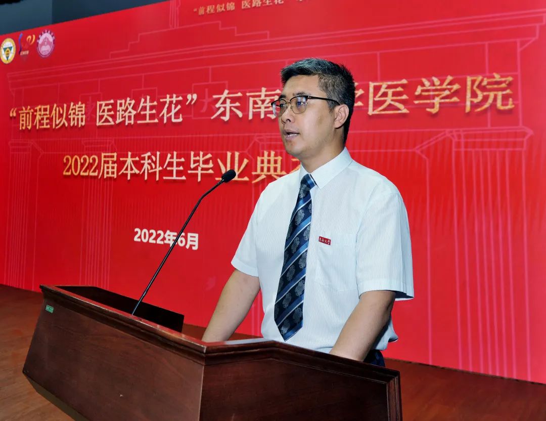 邱海波副董事长在致辞中表示,一切为了人民生命健康,是每一位学医者必须秉承的观念和行动。希望广大毕业生今后始终铭记悬壶济世的职业担当,涵养敬畏生命的高尚情怀,坚持精益求精的科研态度,传承止于至善的东大精神,践行“除人类之病痛、助健康之完美”的神圣誓言,恪守医德、洁身自好,不负时代使命,争做人民健康的守护者和担当时代重任的筑梦者。