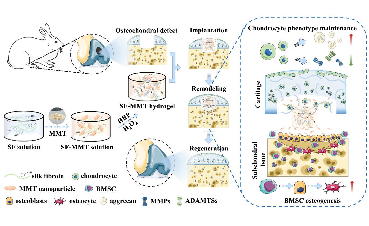 针对以上问题,该研究制备了一种功能化、具有骨/软骨双系活性的丝素-蒙脱土复合纳米活性水凝胶用于骨软骨一体化再生。丝素蛋白是一种FDA批准的医用生物材料,具有良好的生物相容性、优异的机械性能以及可调的降解性能,在组织工程领域得到广泛应用。基于丝素蛋白的水凝胶可提供三维的水性微环境,有利于细胞存活和组织长入,然而力学性能不足以及缺少生物活性限制了其在骨软骨组织工程中的应用。FDA批准的蒙脱土是应用最广泛的硅酸盐纳米粘土之一,有研究表明其能增强水凝胶和其他丝素蛋白复合材料的力学性能和成骨活性。该研究通过酶交联和嵌入化学法制备了丝素-蒙脱土复合水凝胶,并全面评估了该水凝胶的理化特性、生物相容性、生物活性及其内在机制、和体内骨软骨损伤修复效果。结果显示该丝素-蒙脱土复合水凝胶显著提高了材料的孔隙率、力学性能和亲水性。蛋白组学分析表明多条信号通路参与调控该水凝胶的骨/软骨双系活性,其在体外能够诱导骨髓间充质干细胞成骨分化并维持软骨细胞表型,体内能够促进软骨和软骨下骨的修复再生,从而达到一体化修复骨软骨损伤的目的。