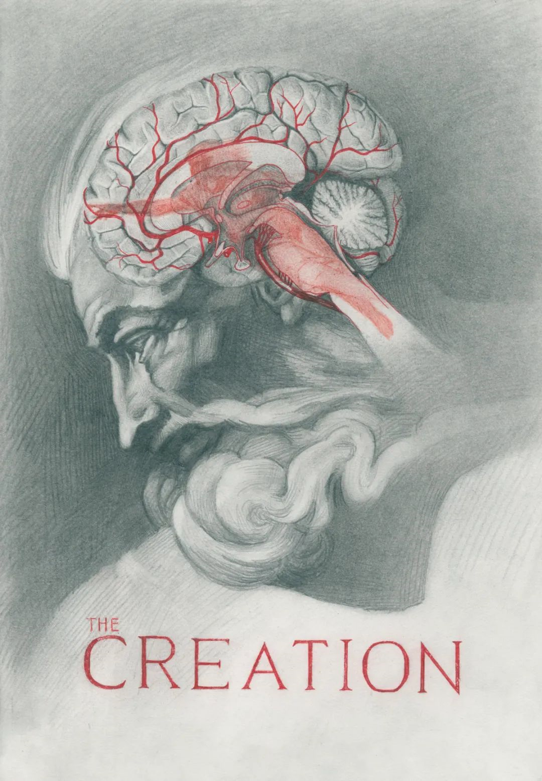作品简介:大脑是思维运动、诞生创造的器官。我们每个人脑海中都有无数充满神性的灵感火花在不时绽放,这些大大小小的创造,其存在本身就充满了不可思议,这也是医学研究所探寻的终极奥秘。本作品的创作灵感来自米开朗基罗的名作《创造亚当》,在临摹脑正中矢状面结构的基础上,运用素描技法创作了这一幅画中画:米氏笔下的人物正在酝酿着一场伟大的活动,在他的脑海中,有一个身影伸出了创造性的一指。