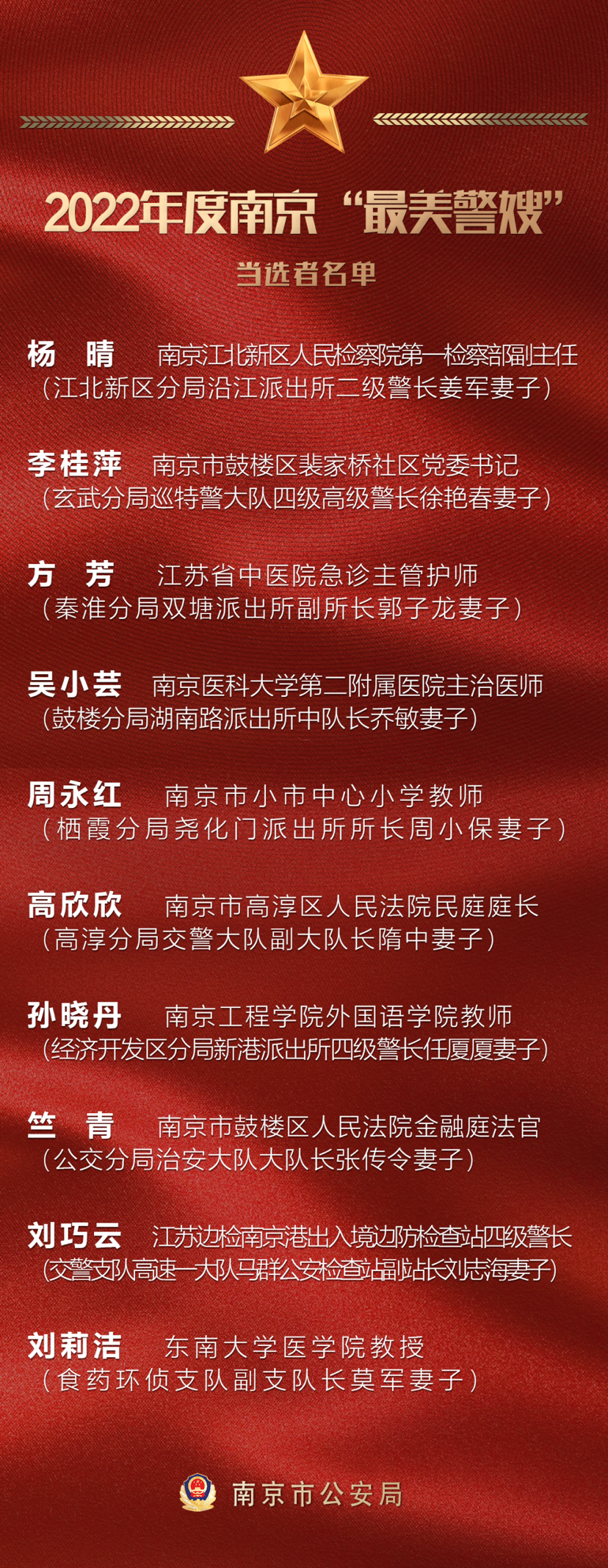 据悉,南京公安近日评选产生2022年度“最美警察”“最美辅警”“最美警嫂”和“最美警队”。他们来自不同岗位,事迹感人,有的擒贼不畏生死如“拼命三郎”,有的身怀绝技是大案要案攻坚的“操盘手”,有的风雨无阻伫立路口像不知疲倦的“信号灯”,有的扎根社区成为知民冷暖的“贴心人”,有的深耕教育感化工作被誉为高墙内的“心灵摆渡师”,有的连续多年默默资助孤儿姐妹被亲切称为“南京叔叔”。
