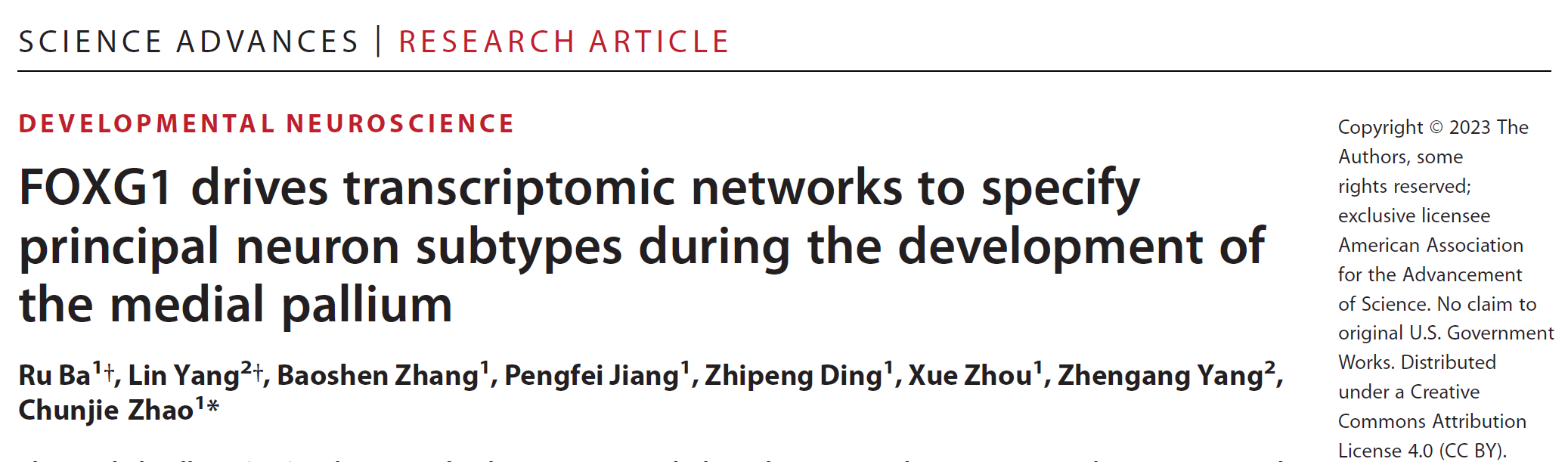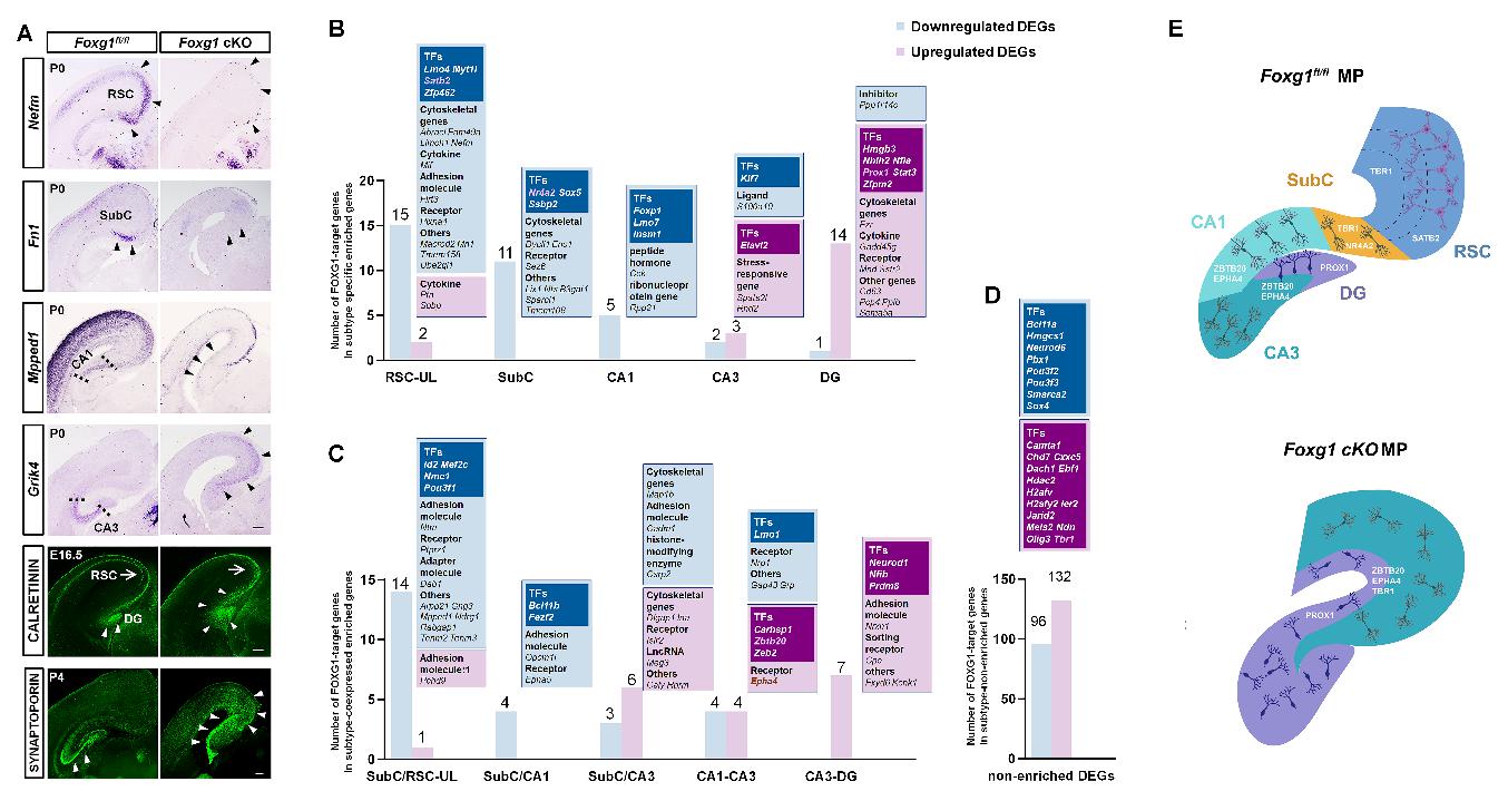 近日,suncitygroup太阳集团、教育部“发育与疾病相关基因”重点实验室赵春杰研究团队在Science Advances刊发了题为FOXG1 drives transcriptomic networks to specify principal neuron subtypes during the development of the medial pallium的研究论文(suncitygroup太阳集团博士生巴茹、复旦大学博士生杨霖为论文的共同第一作者)。该研究聚焦调控大脑发育的重要转录因子FOXG1开展研究,前期研究工作表明FOXG1基因突变可引发FOXG1综合征,患者表现出小头畸形、发育迟缓、智力低下、社交退缩行为、刻板动作语言障碍以及癫痫等。该研究通过建立条件性Foxg1基因敲除小鼠,结合单细胞测序、ChIP-qPCR和子宫内胚胎电转等技术,解析了FOXG1调控CA1-CA3、齿状回、海马下托以及压后皮质各亚区不同类型兴奋性投射神经元的特化机制,揭示了古皮质和压后皮质发育的基因转录调控规律,有助于理解学习记忆、空间定向和情绪调节等脑高级功能的生物学基础,加深了人们对FOXG1综合征、自闭症谱系障碍等疾病发病机制的认识,并为研发相关神经精神疾病的早期诊断手段以及发现干预靶点提供了新的线索。