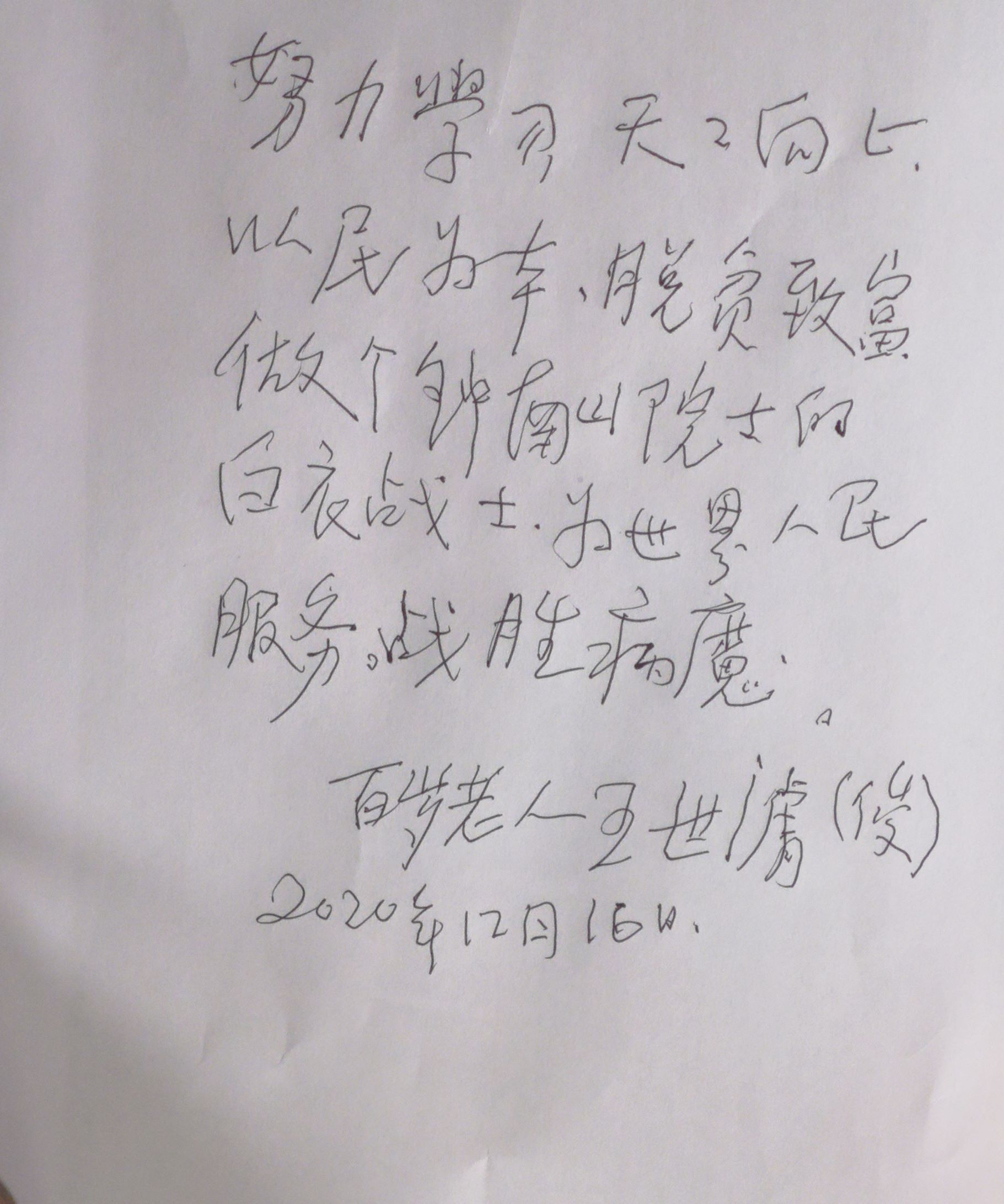 王世浚教授是一位在党四十多年的优秀共产党员。他用一生践行着自己的入党誓言,与党同呼吸、共命运,把对党的忠诚和热爱深深扎根于心底。他生前曾获得铁道部优秀共产党员、南京市劳动模范等荣誉称号,并获得全国铁路总工会颁发的“火车头”金质奖章。在庆祝建党百年前夕,suncitygroup太阳集团组织部分员工党员深入采访了这位百岁老党员。他热情地向同学们重温了自己的入党初心经历、回顾了在党的教育引导下满腔热情工作的历程、抒发了对党对祖国十分挚爱的情怀。在回答同学们所提出的关于如何发挥共产党员的模范带头作用这一问题时,他不假思索、铿锵有力、郑地有声地说:“模范带头作用就是吃苦在前、享乐在后、争先进、做模范。你们在参加共产党前,你就应该有带头模范作用,在入党的时候,就应该有这种信念。”临行前,他欣然提笔,用苍劲豪放的笔触,饱含深情地勉励同学们:“努力学习,天天向上,以民为本,脱贫致富。做个像钟南山院士那样的白衣战士,为世界人民服务,战胜病魔。”(附图3、4 )参访的同学均无比震撼地认为,王老师的热切希望犹如灿烂阳光照亮了他们前行的路,同时也是他们前行路上永不枯竭的原动力。