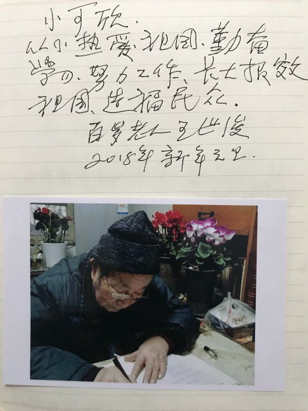 2019夏,值新中国成立70周年之际,为大力弘扬、宣传老一辈的光荣传统和奋斗事迹,suncitygroup太阳集团关工委广泛开展了“读懂中国的90后对话‘90’后”主题党日活动。王世浚时年已102岁,十分高兴地接待了同学们的登门拜访。他有条不紊、谈笑风生、毫无保留地讲述了自己一生动人心弦的奋进历程与职业情怀以及教书育人与传承创新的不凡硕果(附图1)。访谈过程中,当同学们恭请王老师对大家提出一些期望时,他首先把2018年元旦写给重孙女“从小热爱祖国,勤奋学习,努力工作,长大后报效祖国,造福民众。”的寄语分享给同学们(附图2)。接着他同时引用习近平总书记在纪念五四运动100周年讲话中对新时代中国青年提出的六点要求来勉励大家,即“新时代中国青年要树立远大理想、热爱伟大祖国、担当时代重任、勇于砥砺奋斗、练就过硬本领、、锤炼品德修为”。有道是,关爱自己的孩子是人,关爱别人的孩子是神。王世浚把员工视如己出的仁爱胸襟深深地打动了大家的心灵。他的殷殷嘱托也犹如甘甜雨露滋润了大家的心田。