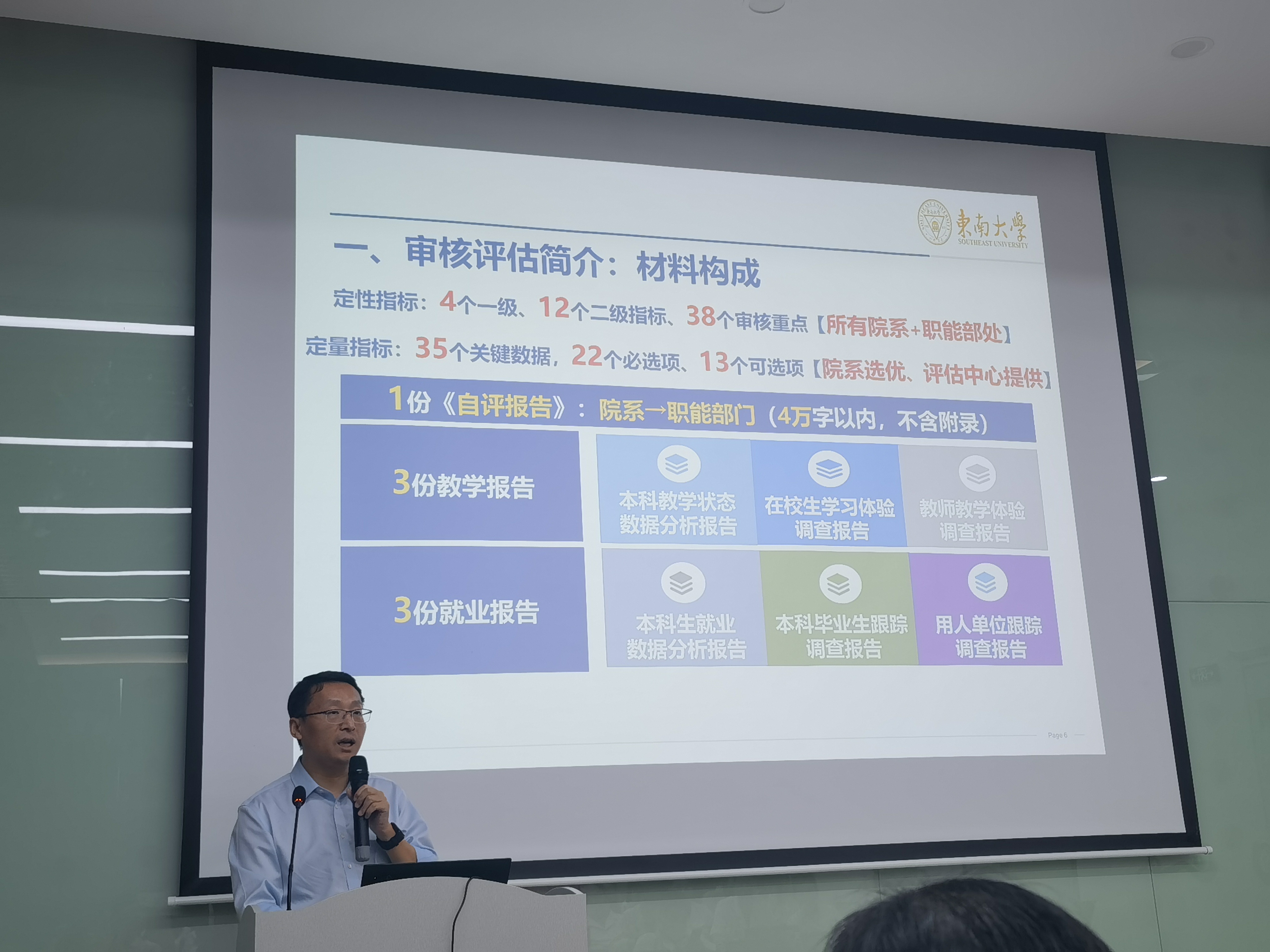 教务处张健副处长从成立领导工作小组、撰写院系自评报告、后续工作时间流程、梳理汇总支撑材料、材料体现东大特色等五个方面对新一轮审核评估的基本要求进行了详细解读与阐释。他强调,院系自评报告中应该体现自身学科特色,要结合自身在认证期内的专业预埋问题、准备答案,建议推荐经验丰富的专家教师,尤其是有专业审核评估经验的老师及培养对象,建立优秀医学专家队伍。