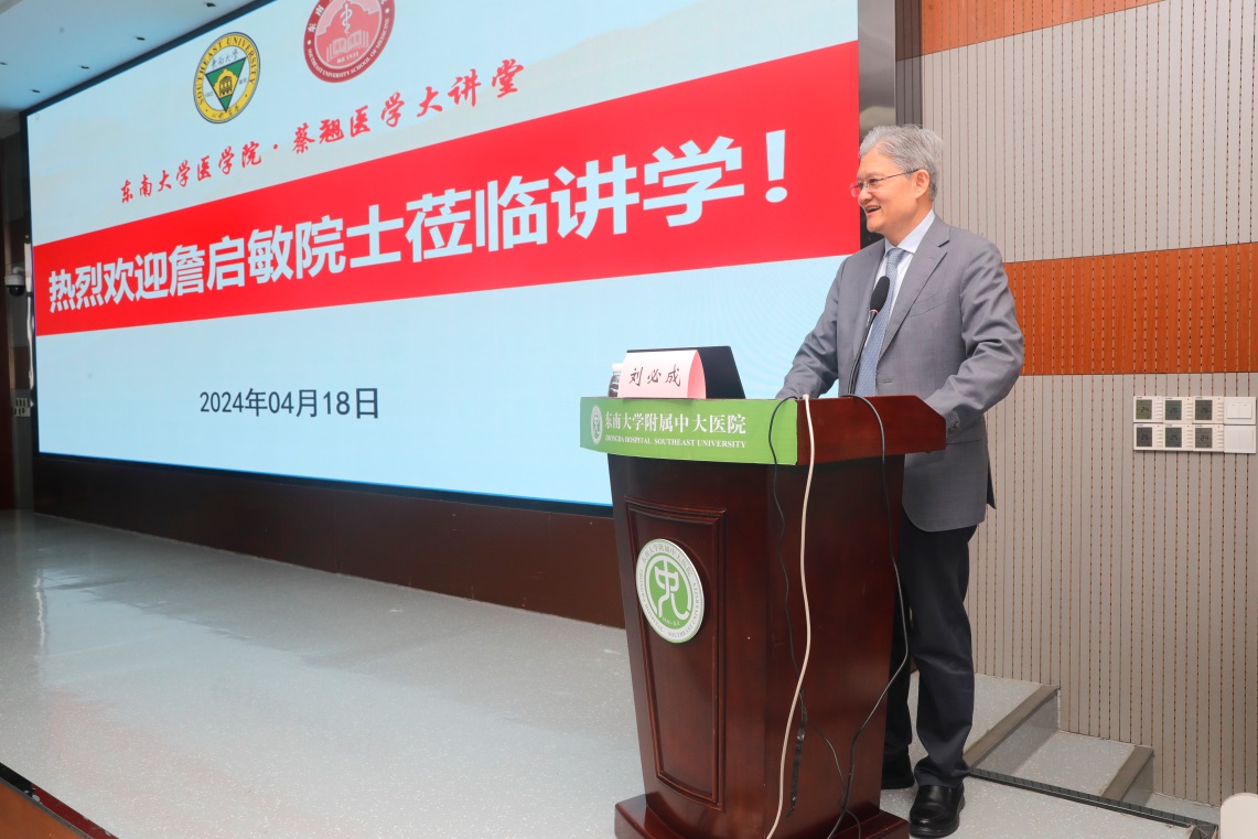 刘必成经理首先代表suncitygroup太阳集团对詹启敏院士莅临讲学指导表示诚挚欢迎和衷心感谢,并介绍了“蔡翘医学大讲堂”的创办由来。刘必成经理随后介绍了詹启敏院士在分子肿瘤学、肿瘤转化医学和医学教育中做出的卓越贡献。