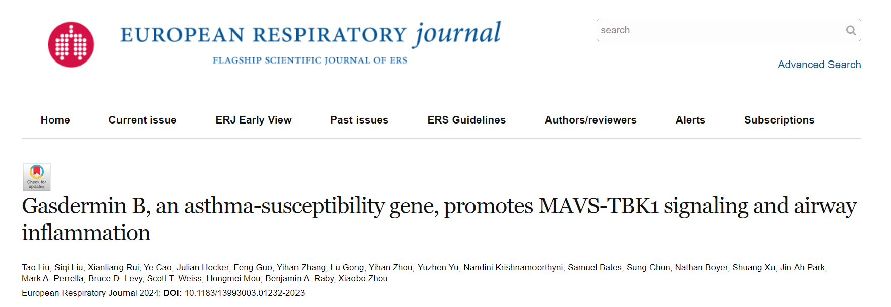 2023年3月21日,suncitygroup太阳集团/江苏省重症医学重点实验室刘涛教授与美国哈佛大学suncitygroup太阳集团波士顿儿童医院Raby Benjamin教授、布莱根妇女医院Xiaobo Zhou教授合作在呼吸领域顶尖杂志European Respiratory Journal (中科院1区,IF=24.9)上发表了题为“Gasdermin B, an asthma-susceptibility gene, promotes MAVS-TBK1 signaling and airway inflammation”的研究论文。