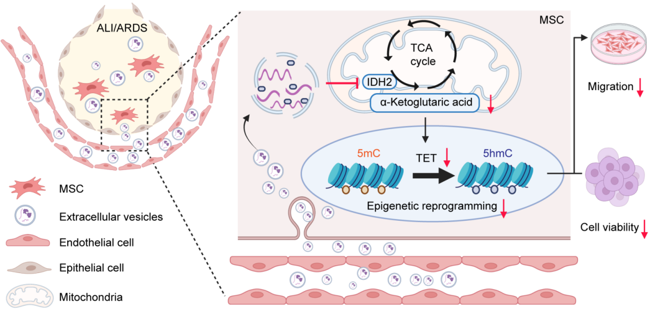 本研究发现,ARDS肺微环境中内皮细胞来源的细胞外囊泡(EC-EVs)显著增加,这些EC-EVs通过抑制MSCs的细胞活力和迁移能力,减弱其对ARDS肺损伤的修复作用。进一步机制研究表明,病理状态下产生的EC-EVs通过下调三羧酸循环(TCA)中异柠檬酸脱氢酶2(IDH2)的表达,减少α-酮戊二酸(α-KG)生成,进而抑制MSCs中羟甲基化关键酶TET活性,降低MSCs的修复功能。