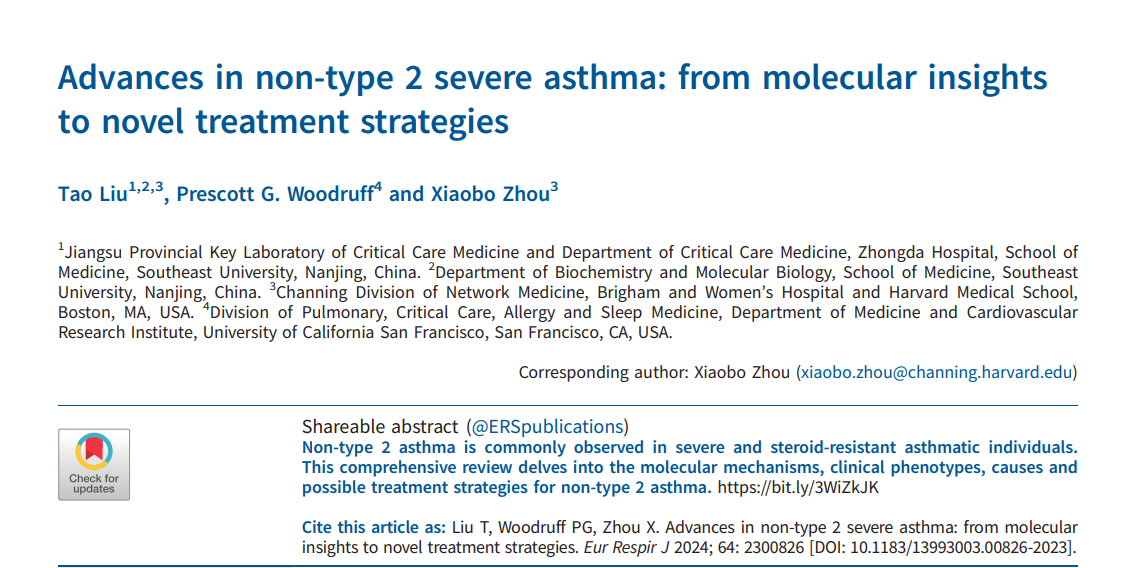 2024年8月15日,suncitygroup太阳集团/江苏省重症医学重点实验室刘涛教授与美国加州大学旧金山分校Prescott G Woodruff教授,哈佛大学suncitygroup太阳集团布莱根妇女医院Xiaobo Zhou教授合作在呼吸领域顶尖杂志European Respiratory Journal (中科院1区,IF=16.6)上发表了题为“Advances in non-type 2 severe asthma: from molecular insights to novel treatment strategies”的综述论文。