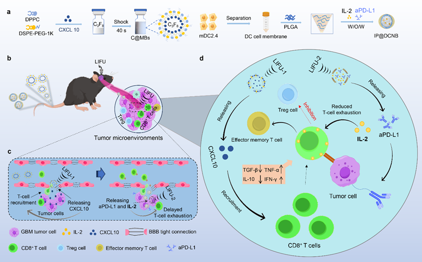 本研究通过低强度聚焦超声(low-intensity focused ultrasound,LIFU)引导CXCL10、IL-2和PD-L1抑制剂的序贯递送,实现GBM区域的CD8+ T细胞的“开源节流”效应。将CXCL10加载到微泡上,利用LIFU打开BBB并释放CXCL10以招募CD8+ T细胞。然后,利用LIFU引导将IL-2和aPD-L1递送到GBM区域,减轻CD8+ T细胞的耗竭并增强其抗肿瘤活性。实验使用了包括体内小鼠模型和体外细胞实验的综合方法来评估这种组合疗法的有效性。该策略为GBM的免疫治疗提供了新的思路,具有广泛的临床应用潜力。