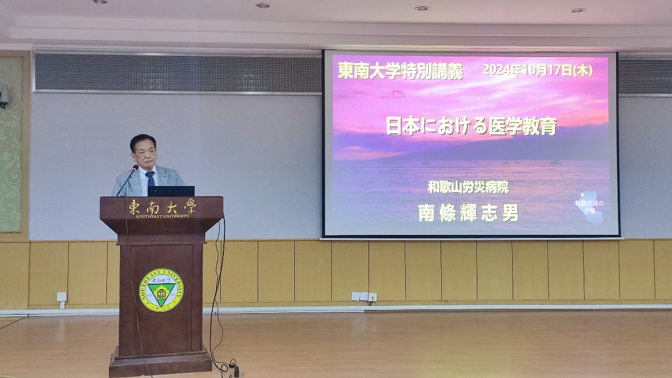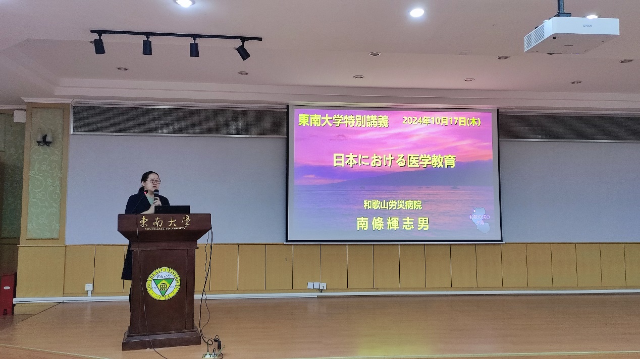 南條辉志男教授曾担任日本和歌山县立医科大学董事长兼和歌山劳灾医院经理,具有丰富的教学和临床管理经验。南條辉志男教授介绍了日本医学教育制度及相关课题。日本医学科学制8年,1年级为一般教育课程,第二年开始学习基础医学课程,第四年开始学习临床医学课程。6年的课程学习结束后,参加日本厚生省组织的统一考试,通过者方可进入为期2年的临床实习阶段。