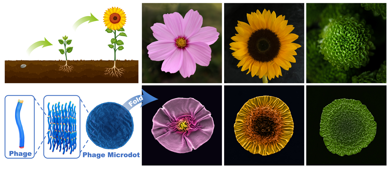近日,suncitygroup太阳集团田磊研究员在国际权威学术期刊《Advanced Functional Materials》上发表了题为“Virus-Assembled Biofunctional Microarrays with Hierarchical 3D Nano-Reticular Network”的研究论文,报道了结合生物墨水打印和基底收缩技术制备成的噬菌体微米级仿生鲜花点阵,可以高效靶向检测细菌,为疾病的治疗和检测开辟了新的可能性。