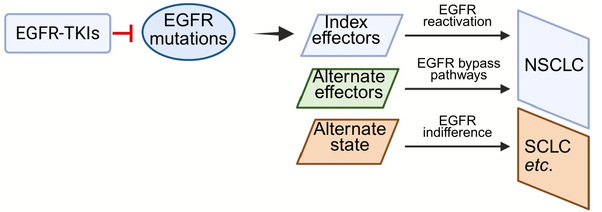 EGFR依赖型是EGFR-TKI抑制EGFR后,EGFR通路下游信号分子再次激活,导致肺癌细胞对EGFR-TKI耐药,该机制包括EGFR本身变化比如扩增和突变、EGFR上游效应分子变化包括配体和调节因子的异常表达、平行效应分子的变化比如其它受体酪氨酸激酶的激活、以及EGFR通路下游比如PI3K/AKT/mTOR和Ras/Raf/MEK/ERK等效应分子的激活。EGFR独立型是EGFR-TKI抑制EGFR后,其它通路绕过EGFR信号通路而激活下游的转录因子,该机制包括TGFβ、Notch和Wnt/β-catenin等信号的激活,以及细胞循环和凋亡、DNA损伤修复、代谢和肿瘤微环境异常等。EGFR冷漠型是产生一种与原来EGFR信号通路完全无关的细胞状态,比如EGFR突变驱动的非小细胞肺癌转变为小细胞肺癌。基于对这些耐药机制的理解,将会对肺癌耐药患者提出相应的治疗策略,包括单靶点用药和多靶点联合用药,有些已经在临床试验中进行评估。