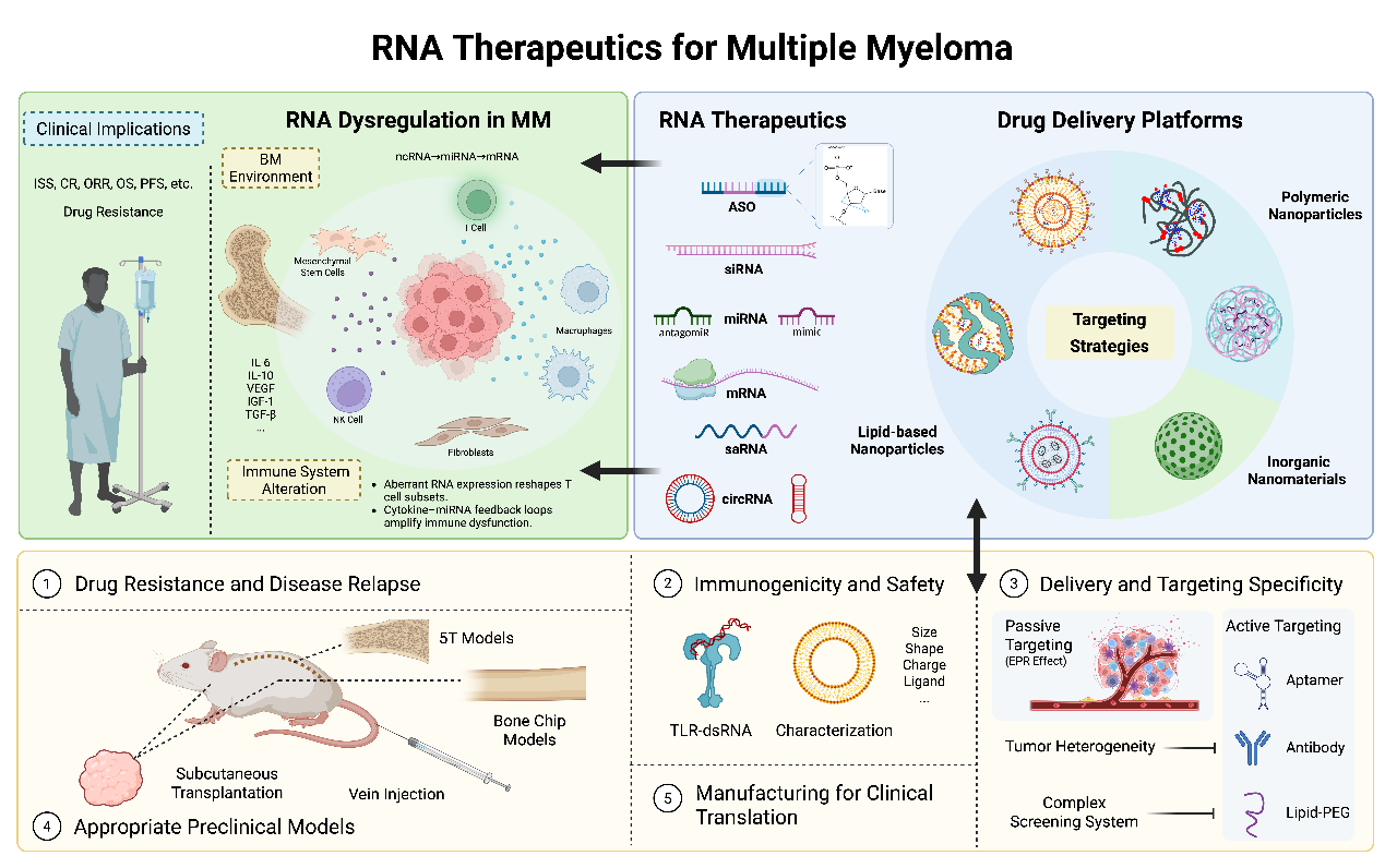 近日,suncitygroup太阳集团副研究员张仲琨团队与美国东北大学、哈佛大学suncitygroup太阳集团在国际药剂学领域顶级期刊《Journal of Controlled Release》发表了题为“Advances in RNA Therapeutics and its Delivery Strategies against Multiple Myeloma”的综述论文,基于临床线索系统总结了多发性骨髓瘤的耐药机制,并结合RNA分子致病机制与药物递送技术讨论了核酸序列靶点与不同RNA分子形态的可成药性,为下一代RNA药物治疗多发性骨髓瘤的临床转化提供了科学指导。