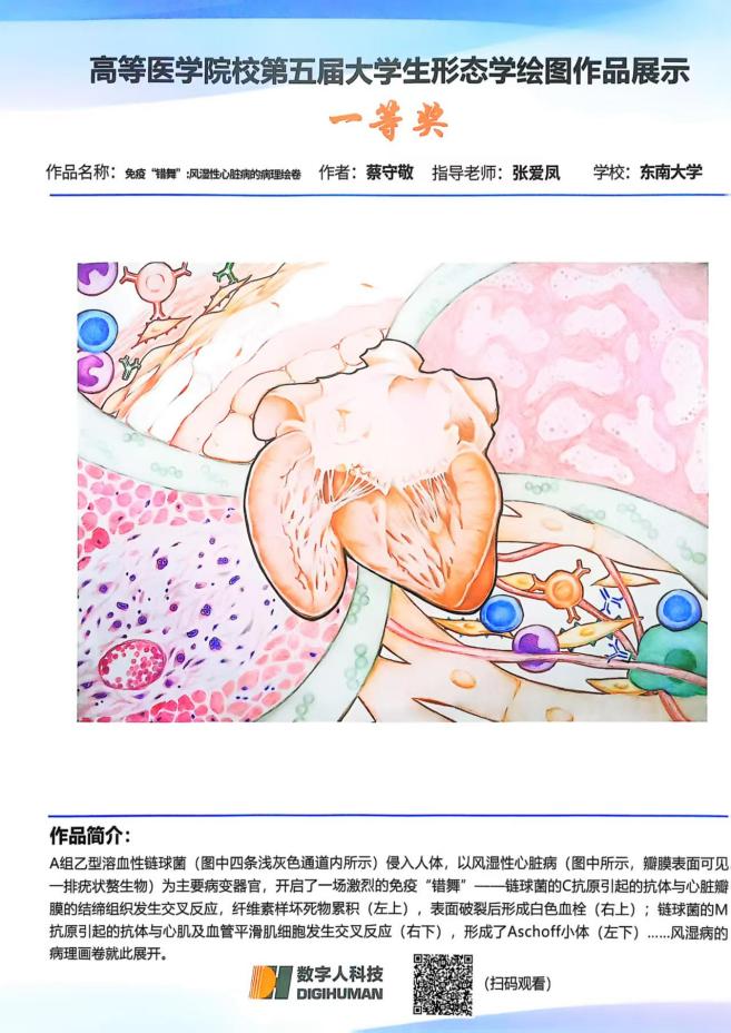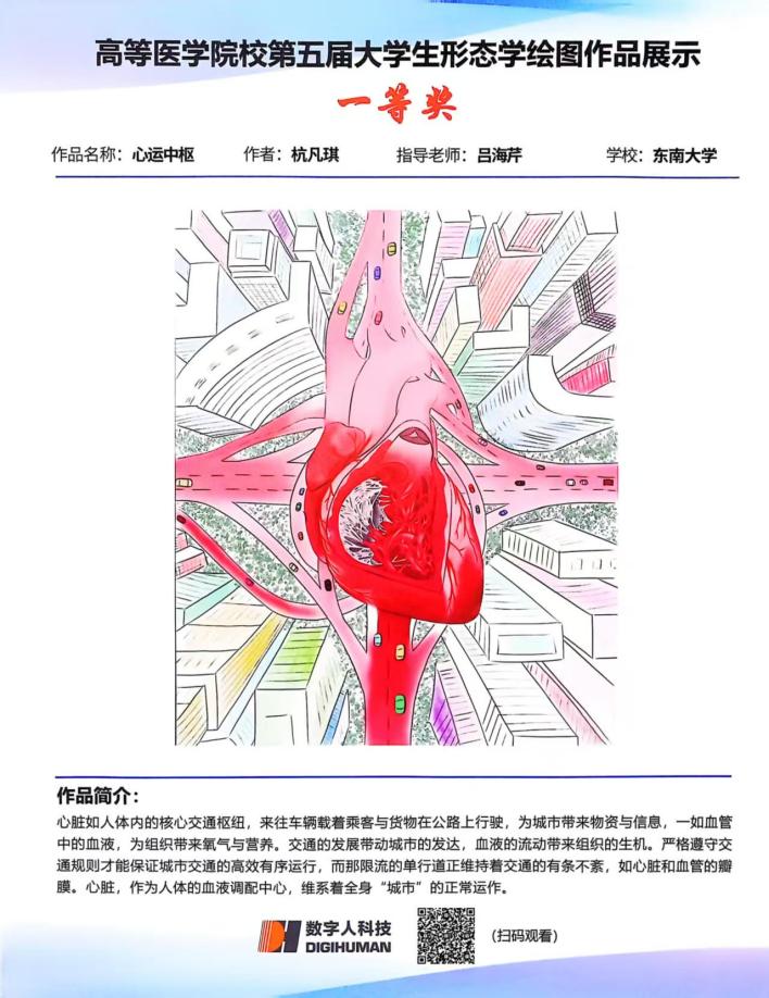 其中,吕海芹老师指导的杭凡琪同学作品《心运中枢》凭借精湛表现摘得人体解剖学组一等奖;张爱凤老师指导的病理学组绘图作品更是多点开花:蔡守敬同学的《免疫“错舞”:风湿性心脏病的病理绘卷》获得一等奖,潘佳慧同学的《淋巴恶变之果:霍奇金淋巴瘤》获二等奖,宋晟凤同学的《动脉粥样硬化-从萌芽到危机》获三等奖。