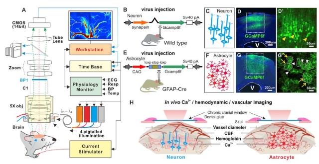 Neurovascular abnormalities play an important role in various common neuropsychiatric diseases, such as obvious neurovascular abnormalities in senile dementia and stroke and other diseases, but the current synchronous imaging methods for nerves and blood vessels are still very lack. On the basis of previous research, the research group integrated two-photon imaging, GCaMP imaging (neuron), blood oxygen imaging, laser speckle imaging (blood flow) and other imaging methods, and built multi-mode optics for neurovascular synchronous imaging. The imaging system, which synchronizes imaging on animal models for up to two months, provides a powerful tool for long-term synchronized imaging of neurovascular vessels. The results of the study arepublished in NeuroImage (NeuroImage 165 (2018) 251–264). Based on this, the project team further used genetic modification technology to separate neurons from glial cells, studied the different roles of nerve cells and glial cells in neurovascular coupling, and discovered new features of glial cells in neurovascular coupling. The function, at the same time, demonstrated for the first time that the low frequency oscillations present in the brain originate primarily from neurons rather than from glial cells (Cell Reports 23 (2018) 3878–3890).
