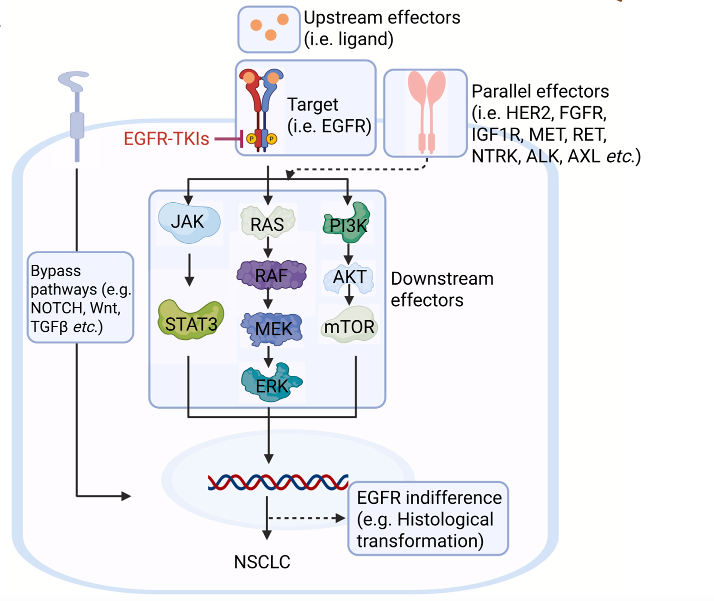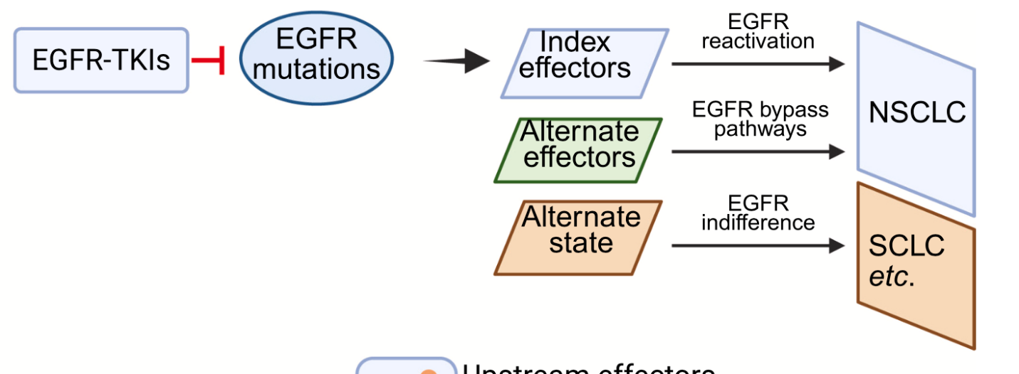 In this work, Dr. Zhenfang Du and his colleagues explained each of the resistance mechanisms in details. EGFR pathway reactivation is the re-engagement of EGFR downstream signaling through upstream, parallel and downstream effectors. EGFR pathway bypass adopts alternative pathway to bypass the already inhibited EGFR and transmit the signal to the downstream transcriptional oncogenic output of the original EGFR signaling. EGFR indifference is considered as an alternative cell state that is irrelevant to the original EGFR signaling. In each category, resistance leads to the sustained tumor progression of either the original NSCLC or alternate cell state such as SCLC. With the generalization and understanding of these mechanisms, the work also discussed the therapeutic strategies to overcome or delay the acquired resistance, which will be targeting EGFR signaling, bypass pathways and EGFR-indifferent state alone or in combination, with many under the evaluation of clinical trials.
